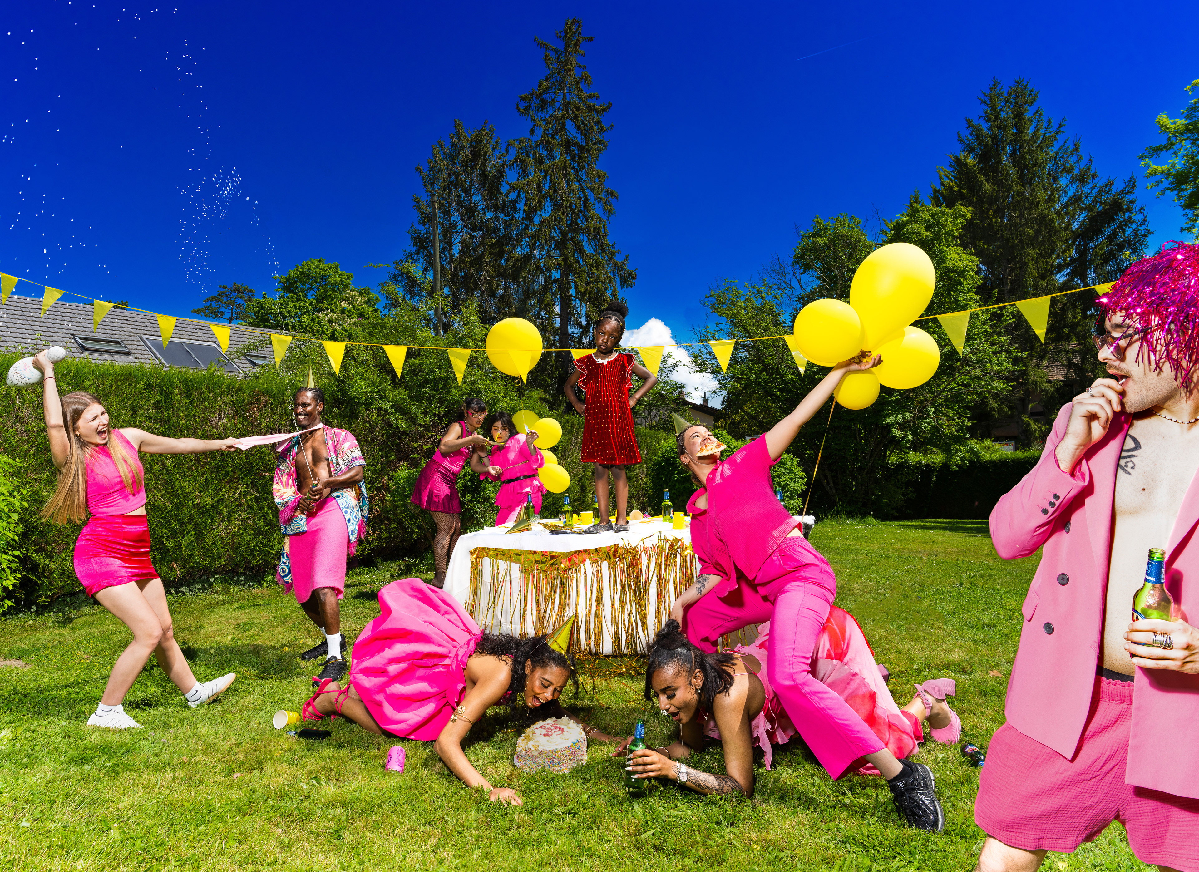 Cette série d'images a pour but d'imiter le style du photographe David LaChapelle. Ayant un style photographique très théâtrale, avec des mises en scènes d'envergure et très impressionantes, LaChapelle créer des décors surréalistes avec souvent, de nombreux modèles recréant une vraie peinture à travers son objectif. Les couleurs sont très éclatantes et très vives avec souvent une lumière frontale réalisée à l'aide d'un flash. Il prend également de nombreux portraits de stars de la pop. Ce qui caractérise David LaChapelle c'est ses thématiques qui reviennent souvent : la spiritualité et la religion, la sensualité et la sexualtié et enfin l'absurdité et le kitch. Ces deux images reprennent la thématique de l'absurde et illustrent une fête d'anniversaire qui vire au drame. Tout semble être inversé, la petite fille au centre de la photographie, seule enfant de l'image, est fâché et et interpelle directement le visionneur en le regardant directement dans les yeux pour l'interroger face à cette scène si chaotique. Son anniversaire est gâché, les adultes se comportent comme des enfants et agisssent de manière complètement immature. Le désordre règne et la scène est complètement loufoque. Ces images invitent à réfléchir sur la maturité supposée à lâge adulte